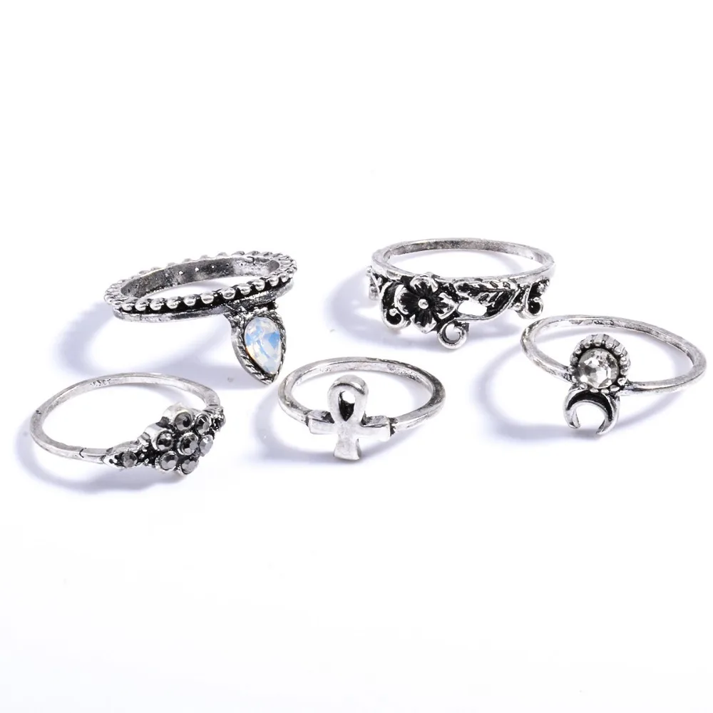 Bohemian Vintage Rhinestone Leaf Moon Jewelry Unique Carving Tibetan Gold Silver Ring Set For Women Punk Boho Ring Sets 5pcs Set